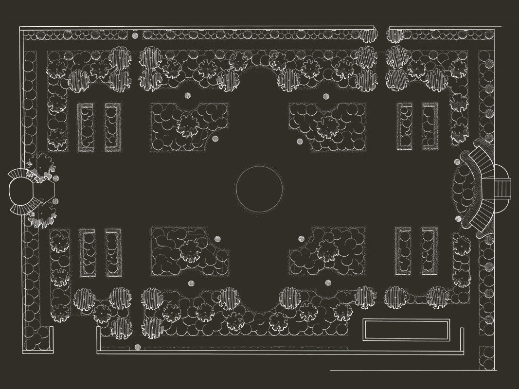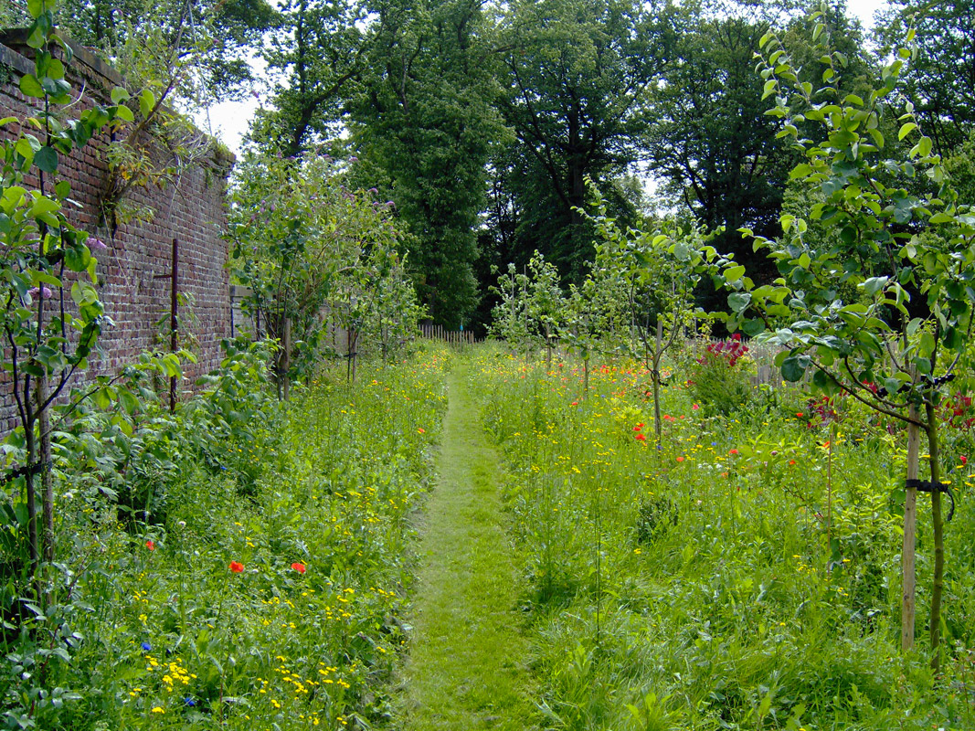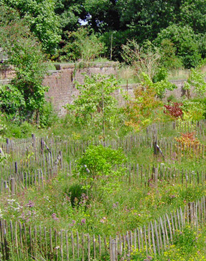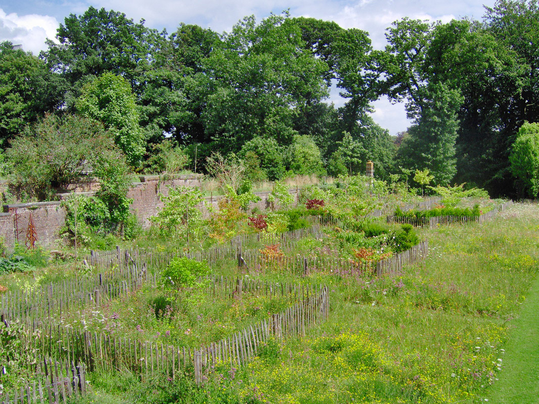 Cet ancien potager reste volontairement une transition entre le jardin existant très structuré et la nature libre du parc 19ème. L'hiver, des moutons y vivent librement entre les enclos abritant les collections d'arbustes et des rosiers.